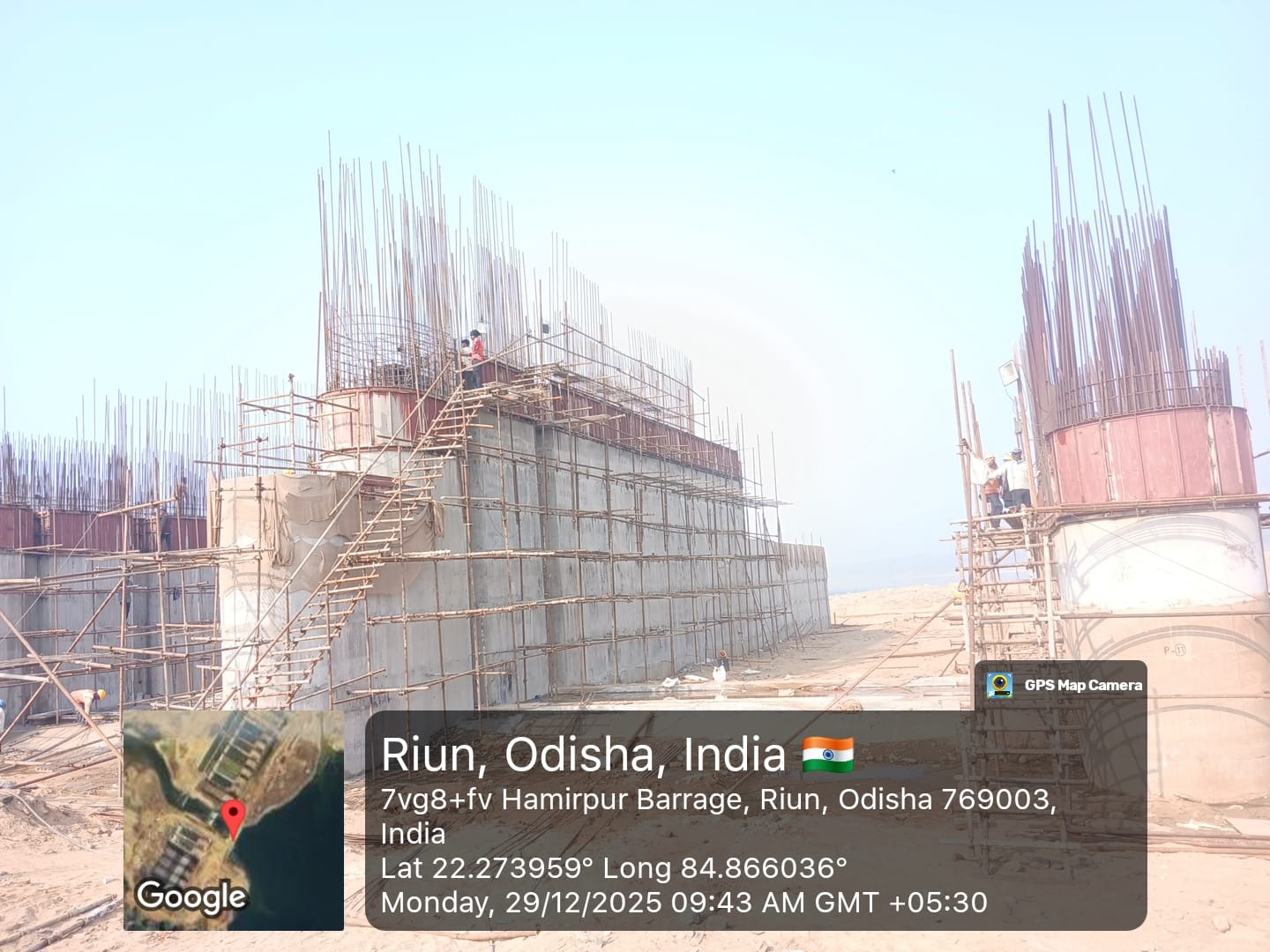 Concrete casting with M35A20 grade for 2nd stage concrete for stoplog & service gate grooves at Pier no.5 of bay no.6 for 1st lift is in progress in presence of JE,KID, PM EPC agency, Site Engineers of PMC & EPC agency. Slump achieved 75mm on 28.12.2025