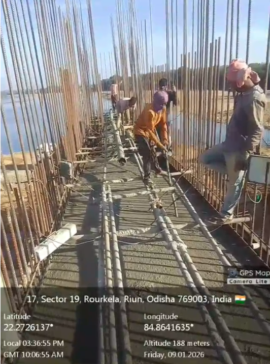 Concrete casting with M35A20 grade for 2nd stage concrete for stoplog & service gate grooves at Pier no.3 for 5th lift of bay no.4 is in progress in presence of Sr. Site Engineer,Site Engineers of PMC & Site Engineer of EPC agency. The slump test value is 70mm on 08.01.2026