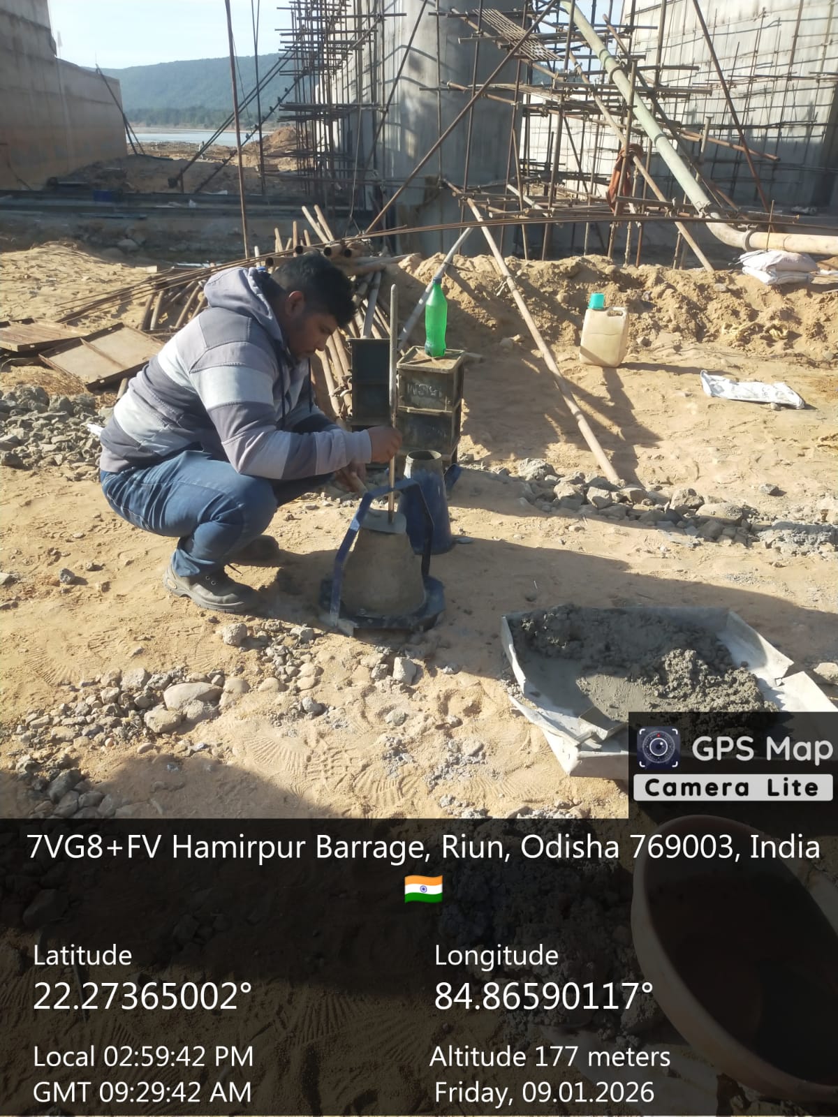 Cast of concrete at right side d/s flank wall including return wall of grade M25A20 2nd lift RCC from RL 150.20 m to 151.40m underprogress through chute in the presence of Dept JE, site engineers of PMC n agency. The slump test value is 75mm on 08.01.2026