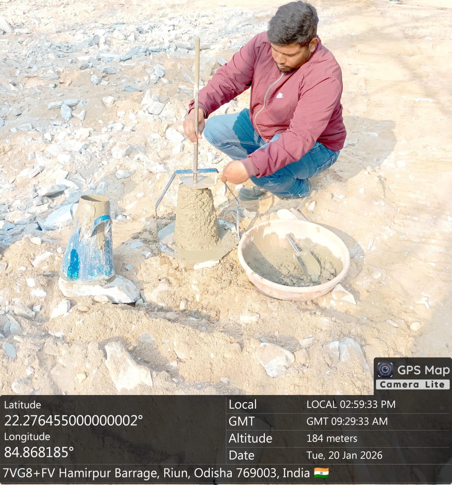 Cast of concrete 5th lift PCC M20A20 grade at right side D/s flared out wall from sec 3-3 to 4-4 with RL 151.00m to 151.60m is under progress in the presence of Dept JE, site engineer of PMC and agency forman. The slump test value is 69mm on 20.01.2026