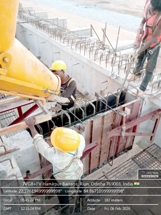 Concrete casting with M35A20 grade for 2nd stage concrete for stoplog & service gate grooves at Pier no.6&7 for 7th lift of bay no.7 is in progress in presence of PM,EPC agency,Site Engineers of PMC & Site Engineer of EPC agency. The slump test value is 84mm on 06.02.2026