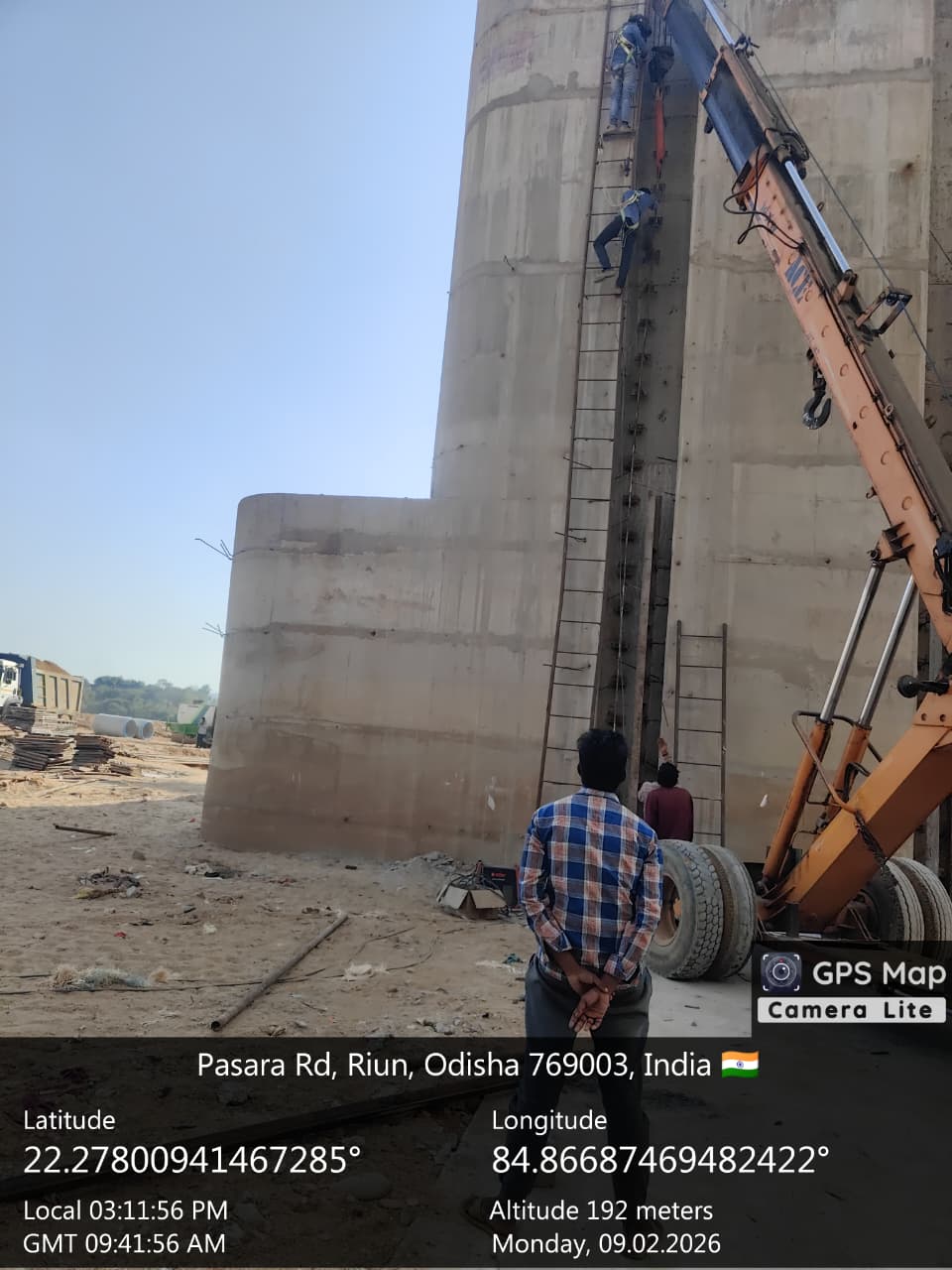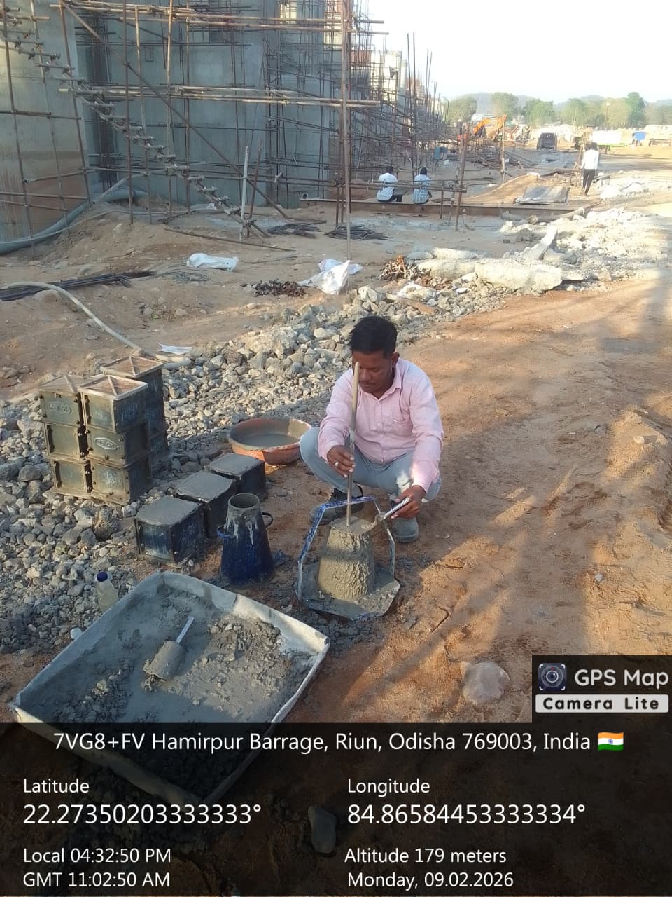 Cast of concrete 15th lift PCC M20A20 grade at right side U/s flard out wall from RL 157.00m to 157.60m is under progress in the presence of Dept JE, site engineer of PMC and agency forman. The slump test value is 71mm on 09.02.2026