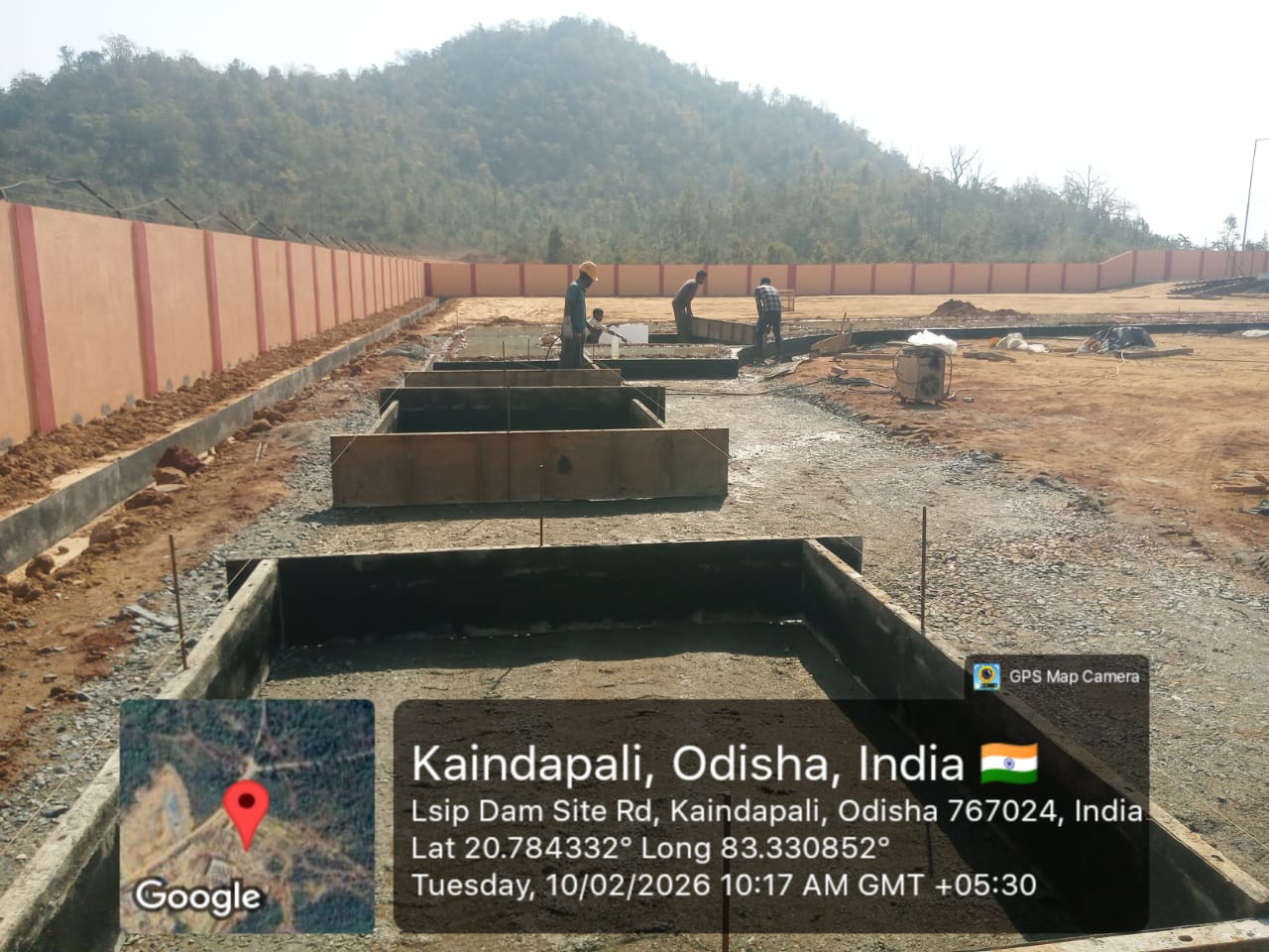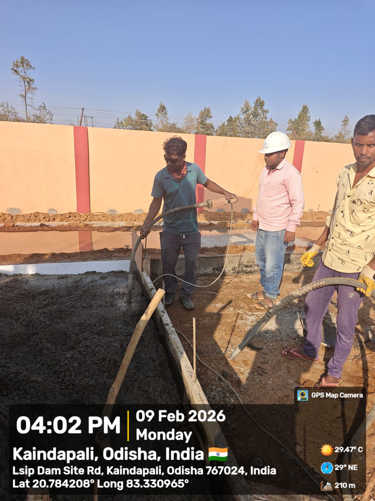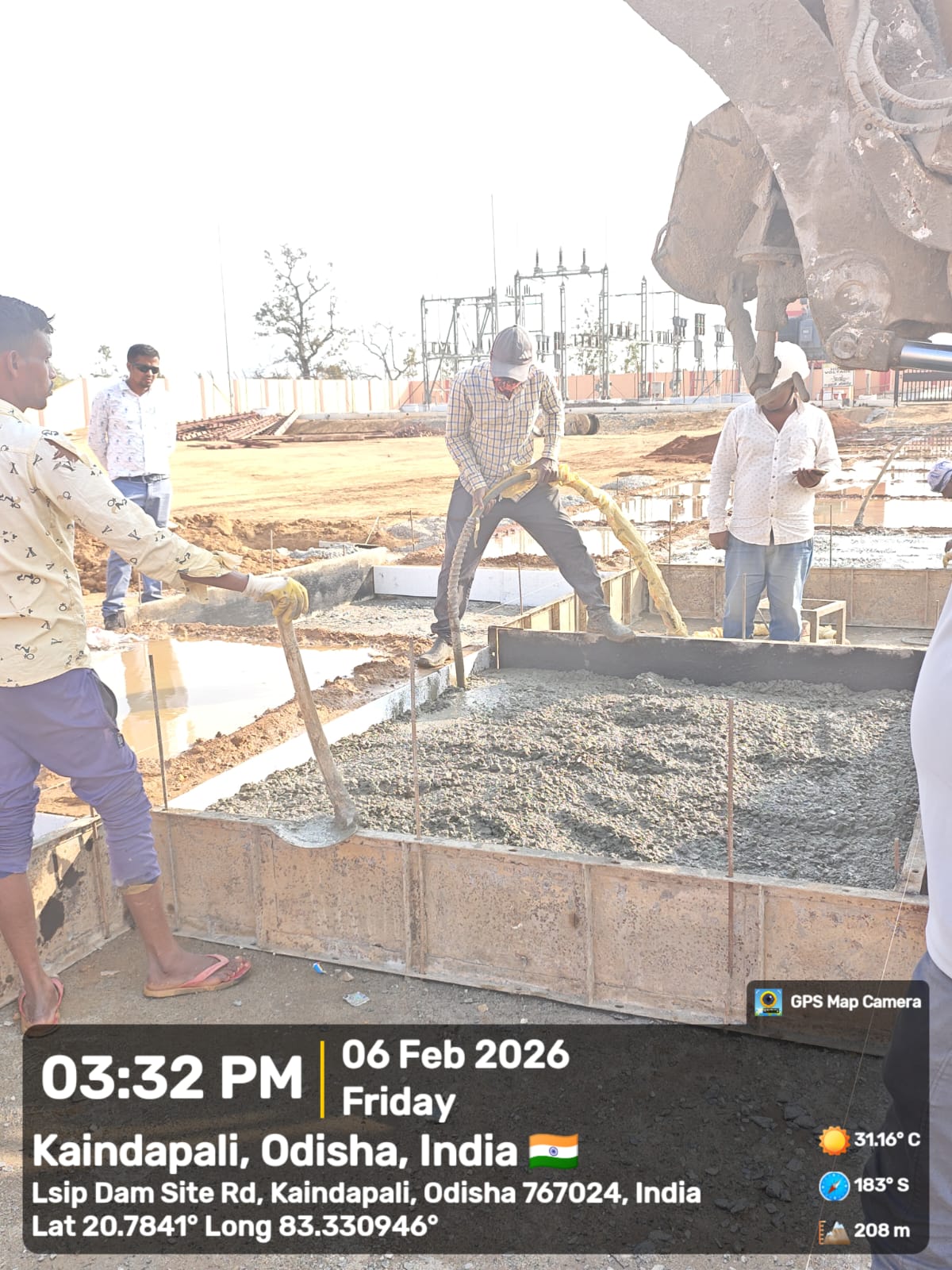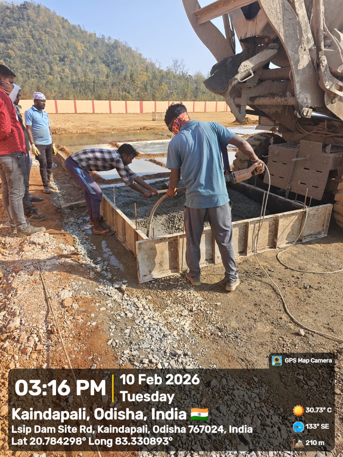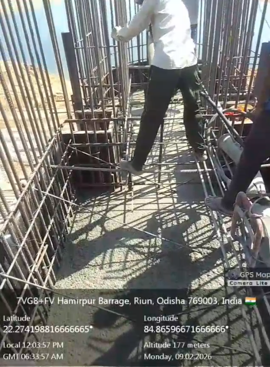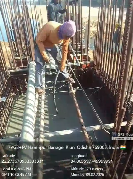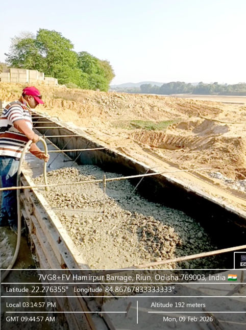 Concrete casting with PCC M15A20 grade of foundation concrete at D/S right Flared out wall 2nd panel for 3rd lift upto RL-234.0m and 4th panel for 2nd lift upto RL-233.70m is in progress in presence of PM EPC agency,Site Engineer of PMC & EPC agency. The slump test value is 78mm on 09.02.2026