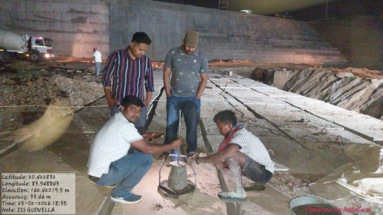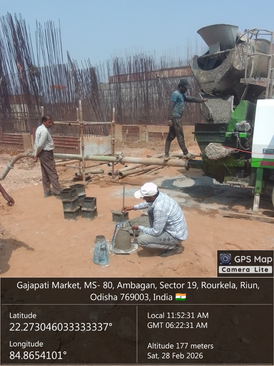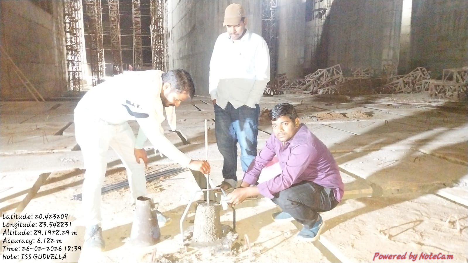 Slump cone test conducted at site. Cube cast at site.