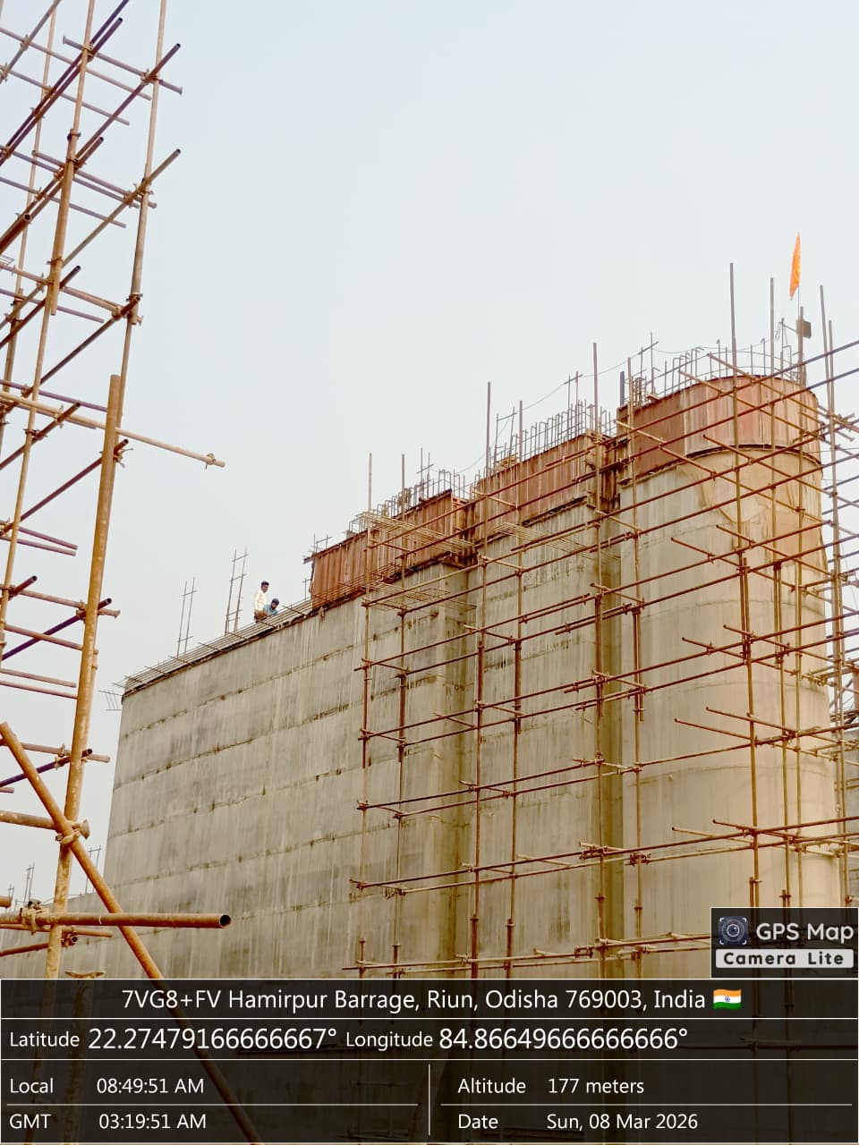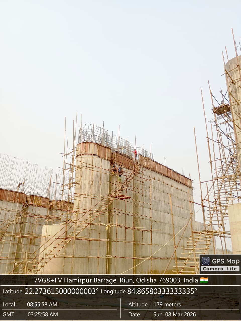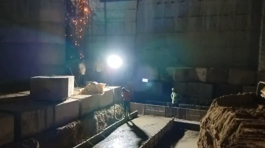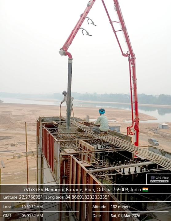 Concrete casting with PCC M20A20 grade of 4Nos. CC block at D/S left Flared out wall i.e 1no. of size 6.0x1.5x0.6m from sec.1-1 to sec. 2-2 for 12th lift and 1no. of ,size 6.0x1.5x0.6m from sec. 2-2 to sec. 4-4 for 15th lift and 1no. of size 6.0x1.5x0.6m at sec.5-5 for 16th lift and 1no. of size 6.0x1.8x0.6m for 17th lift from sec.5-5 to sec.6-6 upto RL-244.80m is in progress in presence of PM EPC agency,Site Engineers of PMC & EPC agency. The slump test value is 78mm on 08.03.2026