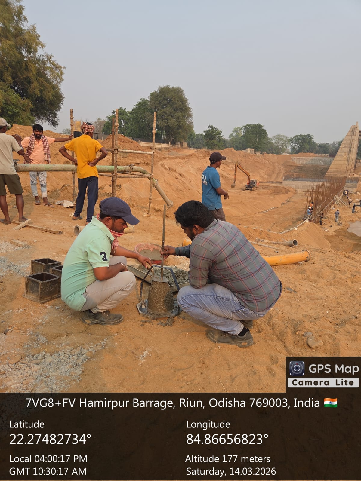 Concrete casting with PCC M20A20 grade of 4nos. CC blocks at D/S right Flared out wall i.e 1no. of size 4.8x1.8x0.6m at sec. 6-6 & 1no. of size 6.0x1.5x0.6m from sec.5-5 to sec.6-6 for 2nd lift & 1no. of size 6.0x1.5x0.6m from sec.4-4 - sec. 5-5 for 1st lift upto RL-237.00m and 1no. of size 6.0x1.5x0.6m from sec.2-2 to sec.4-4 for 1st lift upto RL-238.20m is in progress in presence of PM EPC agency, Site Engineers of PMC & EPC agency. The slump test value is 83mm on 14.03.2026