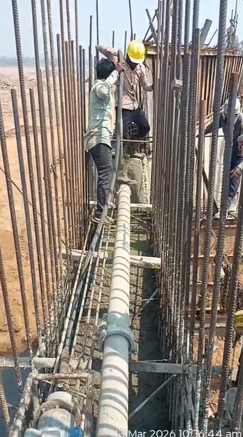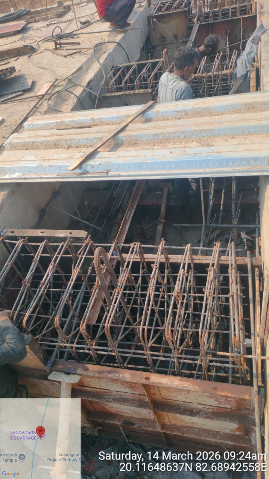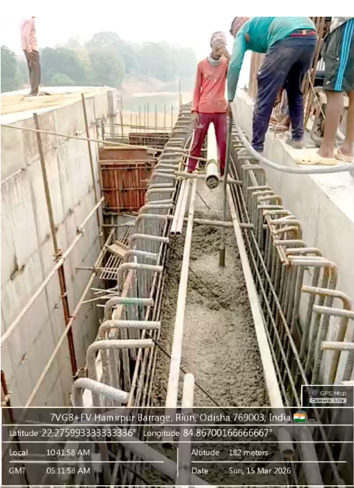 Concrete casting with M35A20 grade for gate grooves sill beam at bay-11 ( Barrage bay-9) is in progress in presence of PM EPC agency Site Engineers of PMC and EPC agency. The slump test value is 89mm on 13.03.2026