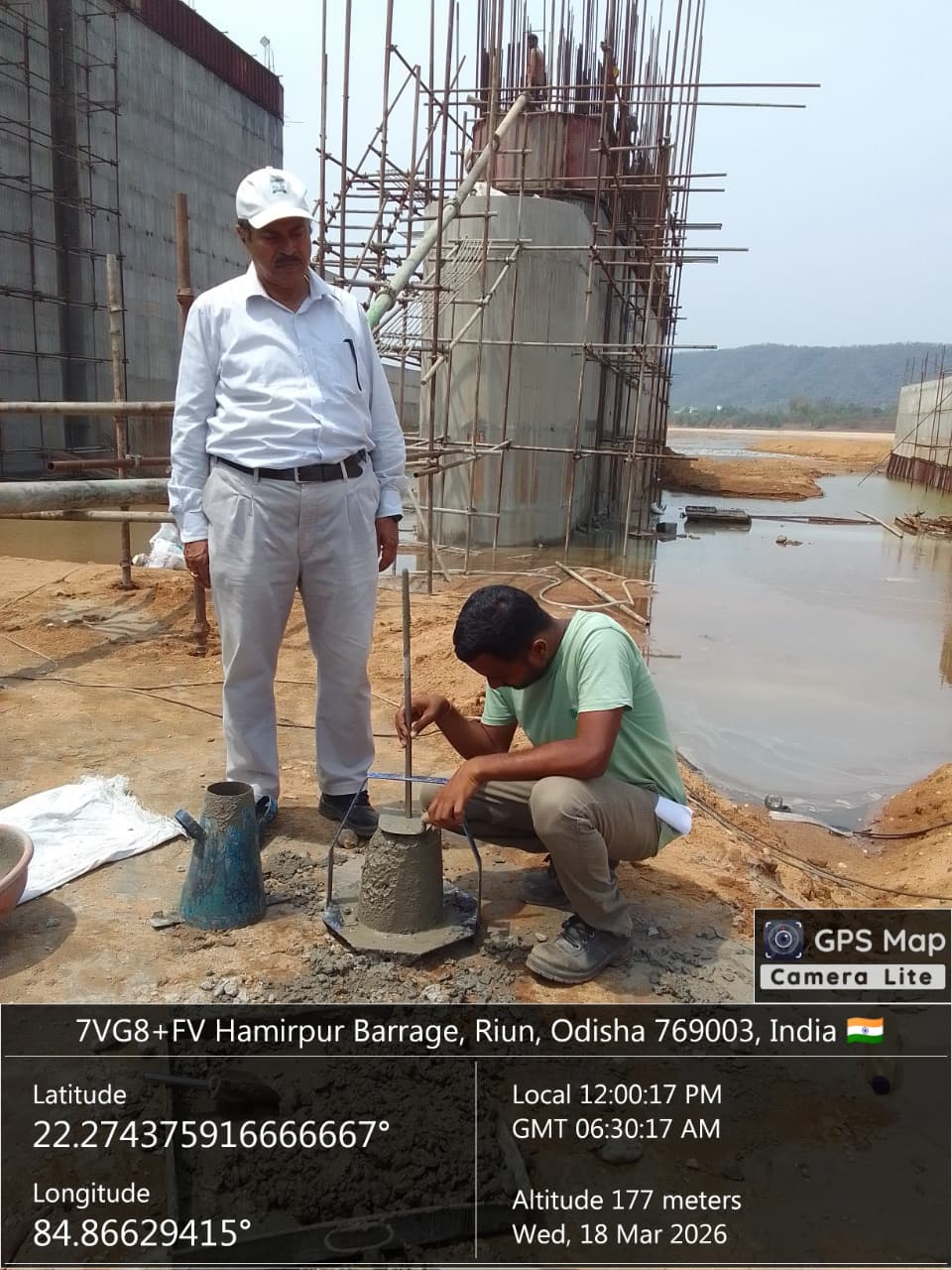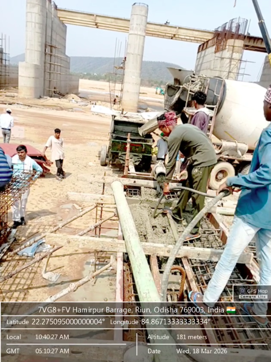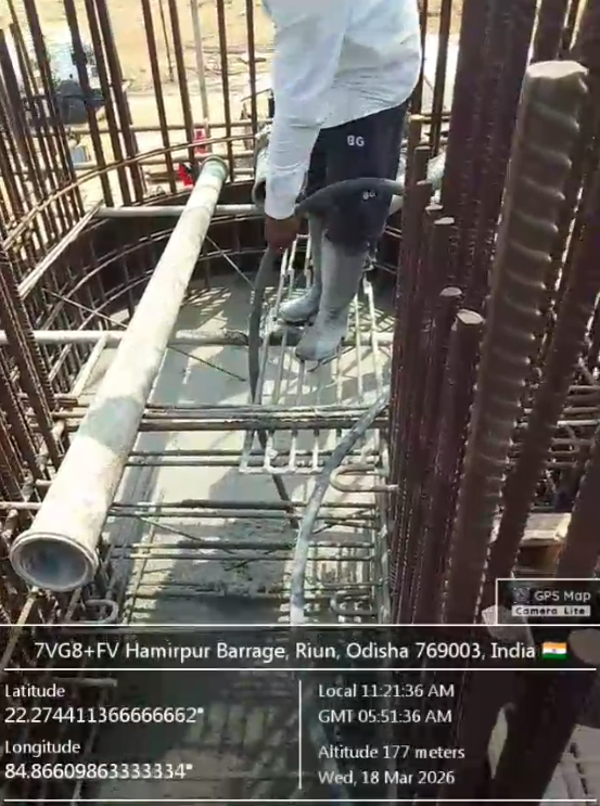 Concrete casting with M35A20 grade of 2nd stage concrete at pier no-1&2 for 8th lift of undersluice bay-2 is in progress in presence of PM EPC agency Site Engineers of PMC & EPC agency. The slump test value is 86mm on 18.03.2026