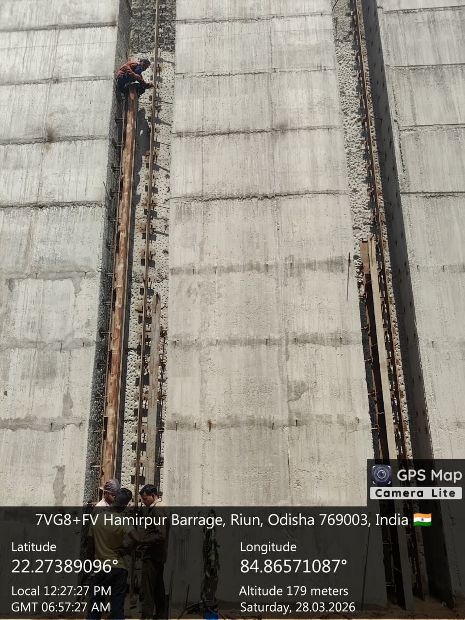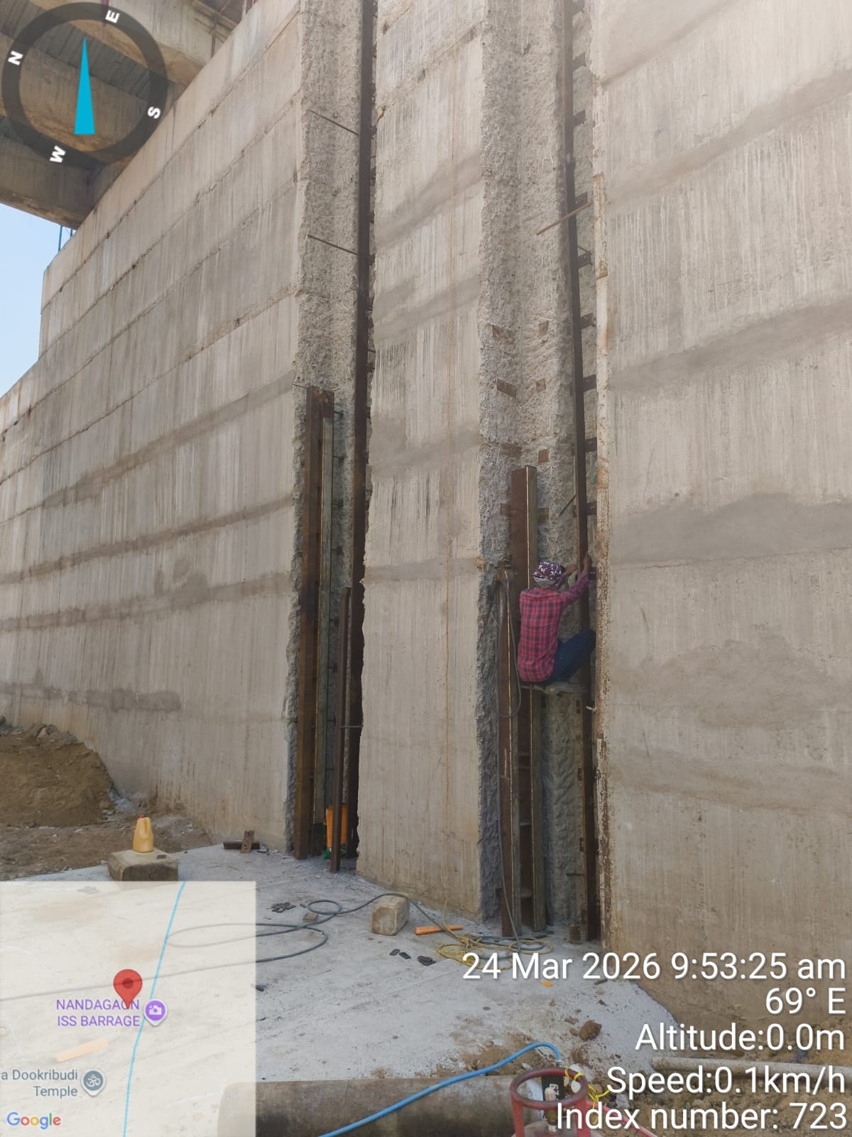 • 1. Fixing & fittings and alignment of 2nd. stage embedded parts and sufficient numbers of dowel bars at roller tracks of both stoplog & service gate grooves at undersluice bay No. 1 of Pier No.1 & left abutment for 6th lift have been checked and found correct by HM Expert of PMC during his site visit on dt.19.03.2026 in presence of all civil n mechanical Site Engineers of PMC and EPC Agency as per the approved Mechanical drawing & designs.
