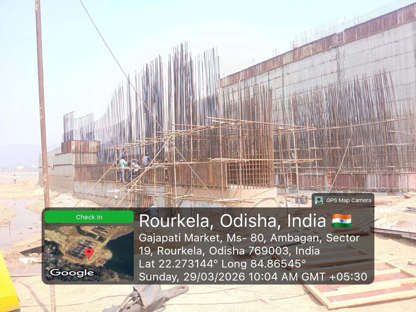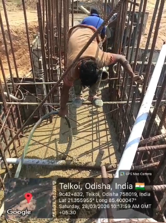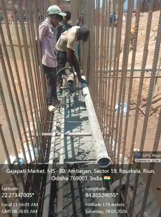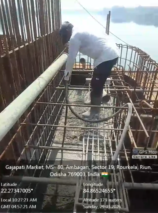 1st lift RCC M30A20 grade at block out area of A1 and P2 from RL 159.50m to 160.40m is under progress in the presence of Dept JE, site engineer of PMC and agency at site. The slump test value is 76mm on 24.03.2026