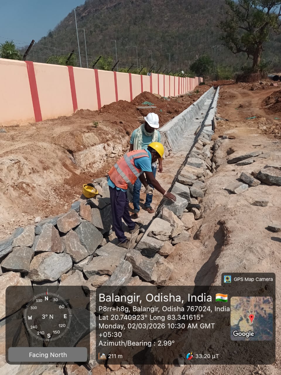 External drain stone pitching work is in progress at Pump House.