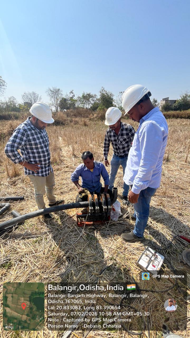 Butt fusion joint work in progress of 75mm Dia HDPE pipe with L bend fixing on outlet point LO-283A,Z-6074 near village Buromunda.