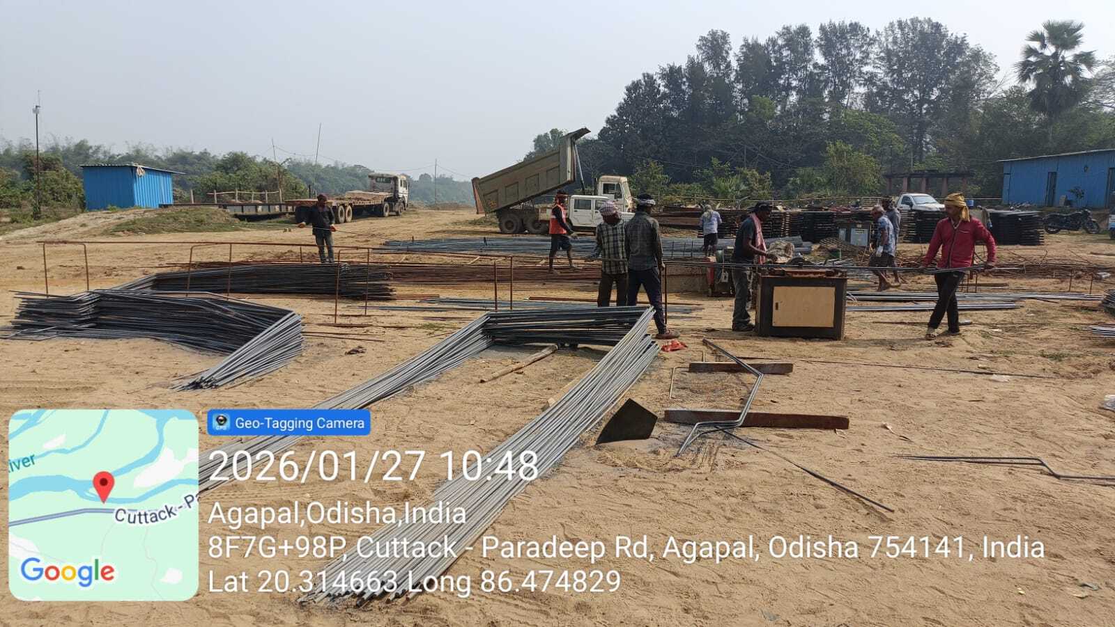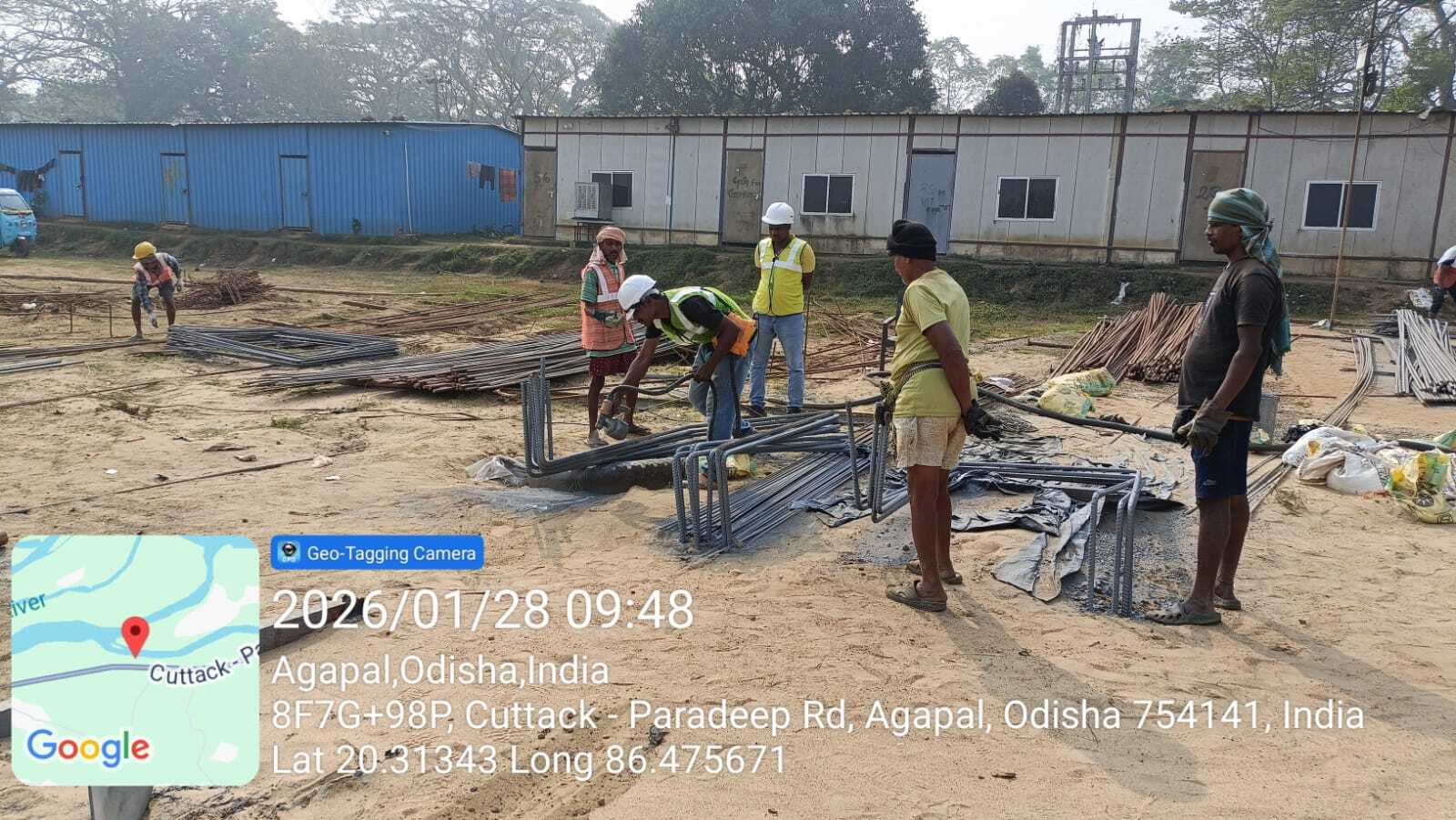 Steel cutting, bending, binding work is in progress.