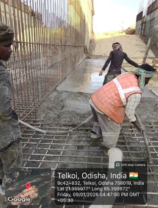 Casting of concrete 3rd lift RCC M25A20 grade at right side D/s wing including 5nos CF from RL 150.15M to 151.50m is under progress through chute in the presence of Dept JE, site engineers of PMC n agency forman. The slump test value is 70mm on 08.01.2026