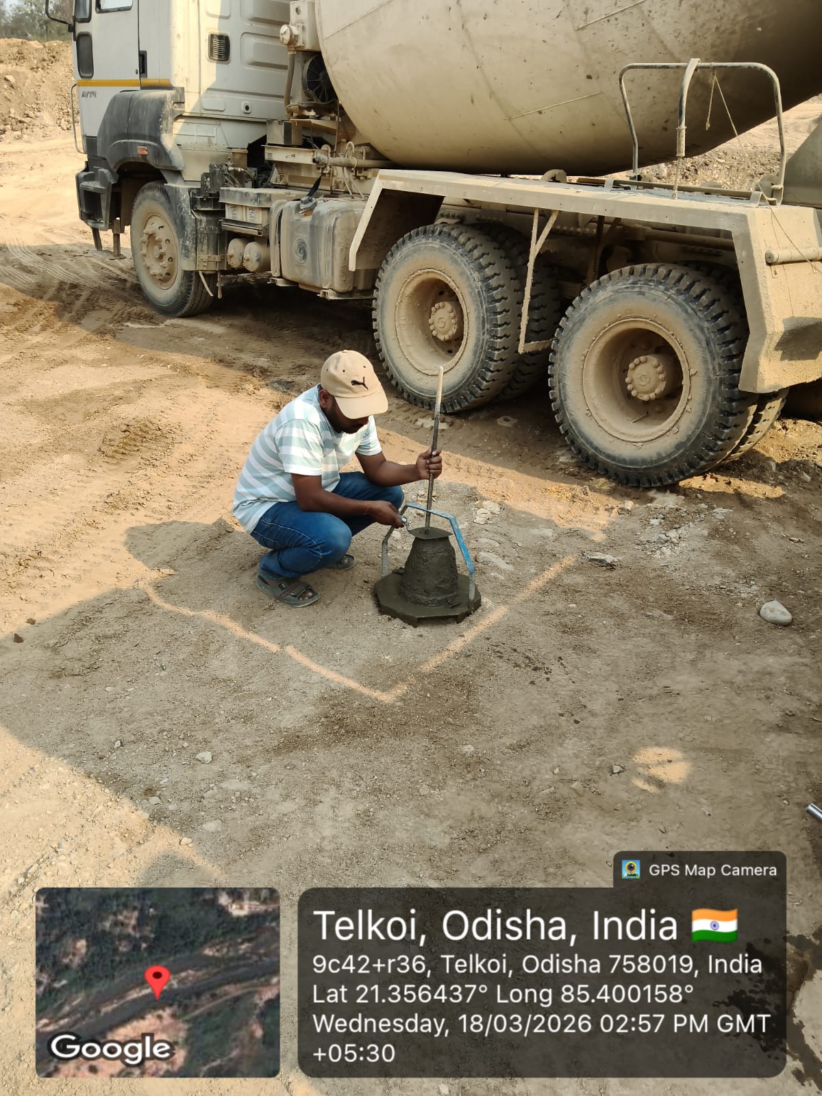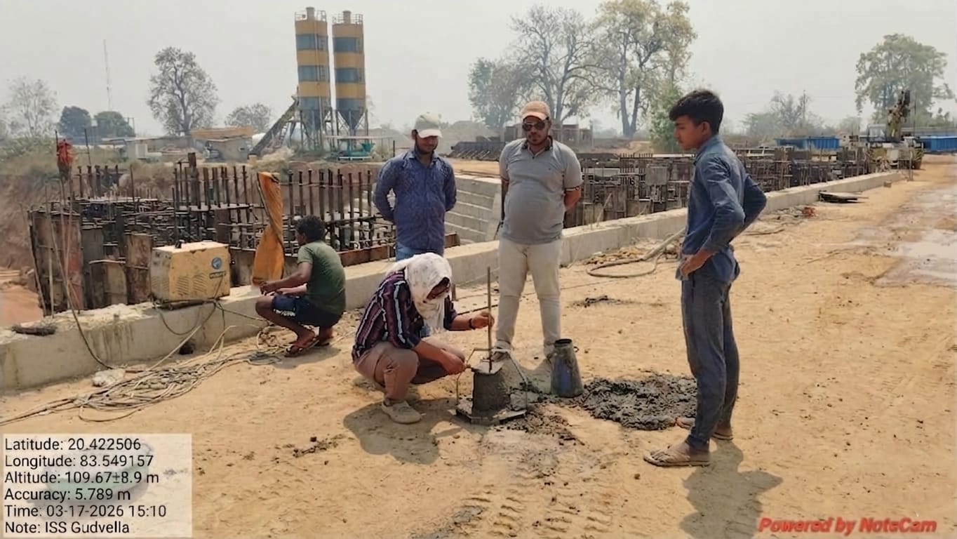 Concrete casting with RCC M35A20 grade for 2nos. Cross girders at middle double pier is in progress in presence of PM EPC agency, Site Engineers of PMC & EPC agency.. The slump test value is 85mm on 18.03.2026