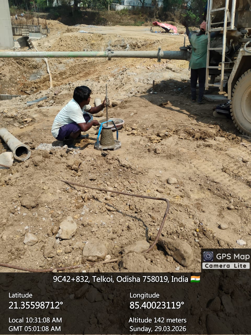 Concrete casting with M35A20 grade of 2nd stage concrete at pier no.8&9 for 2nd lift of bay no.-9 is in progress in presence of Site Engineers of PMC & EPC agency. The slump test value is 78mm on 24.03.2026
