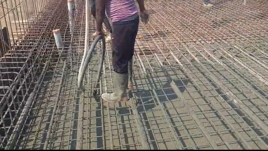 Concrete casting with RCC M35A20 grade of 3nos. RCC main girders for middle double pier is in progress in presence of PM EPC agency, Site Engineers of PMC & EPC agency. The slump test value is 85mm on 14.03.2026