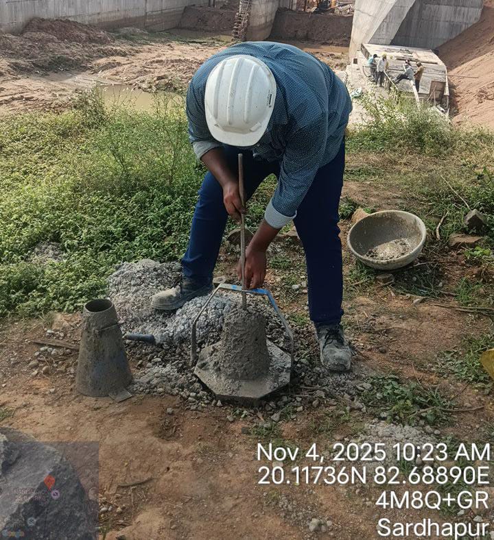 Cast of concrete 4th lift PCC M15A40 grade at left side D/s flard out from sec 1-1 to sec 3-3 with RL 150.40m to 151.00m is under progress in the presence of Dept JE, site engineers of PMC n agency at site. Slump achieved 69mm on 05.11.2025