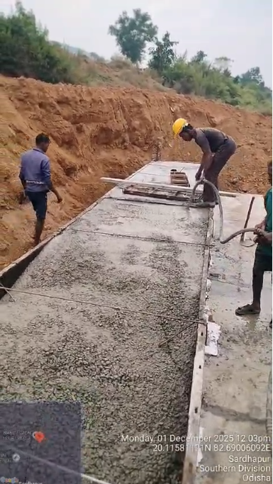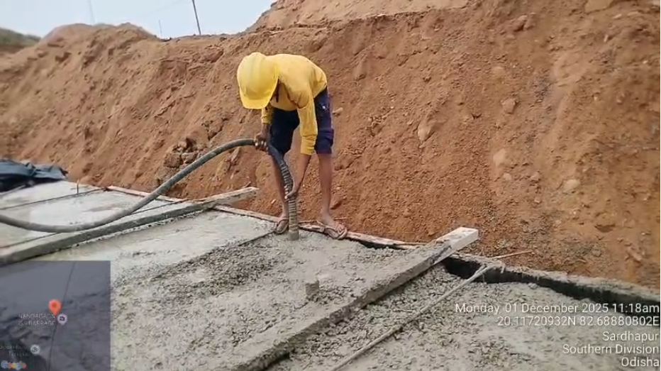 Concrete casting with PCC M20A20 grade for total 2nos. CC blocks at D/S left flared out wall i.e 1no. of size 6.0x1.5x0.6m from sec.5-5 to sec.6-6 for 4th lift & 1no. from sec.4-4 to sec.5-5bfpr 3rd lift of 0.6m hight upto RL-237.60m is in progress in presence of JE,KID, PM EPC agency, Site Engineers of PMC & EPC agency. Slump achieved 72mm on 01.12.2025