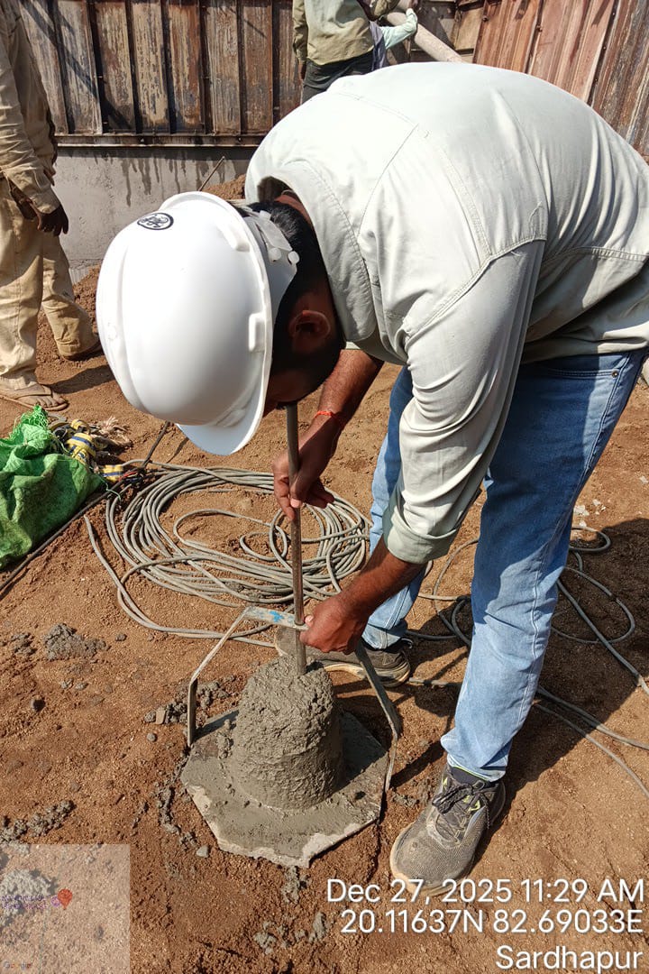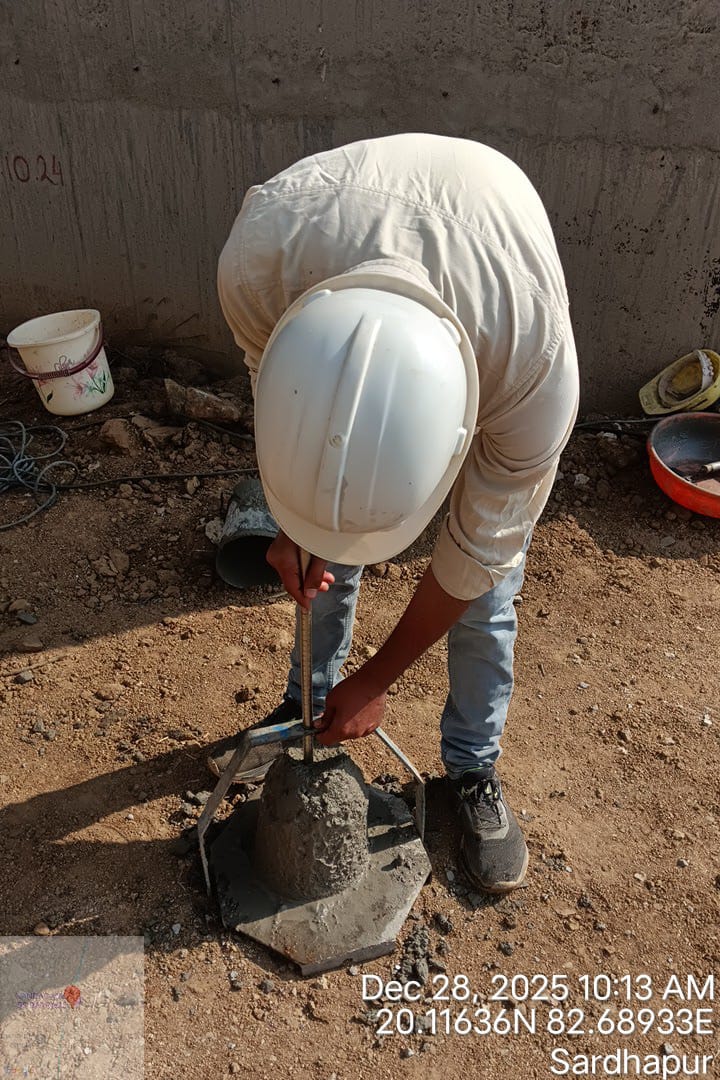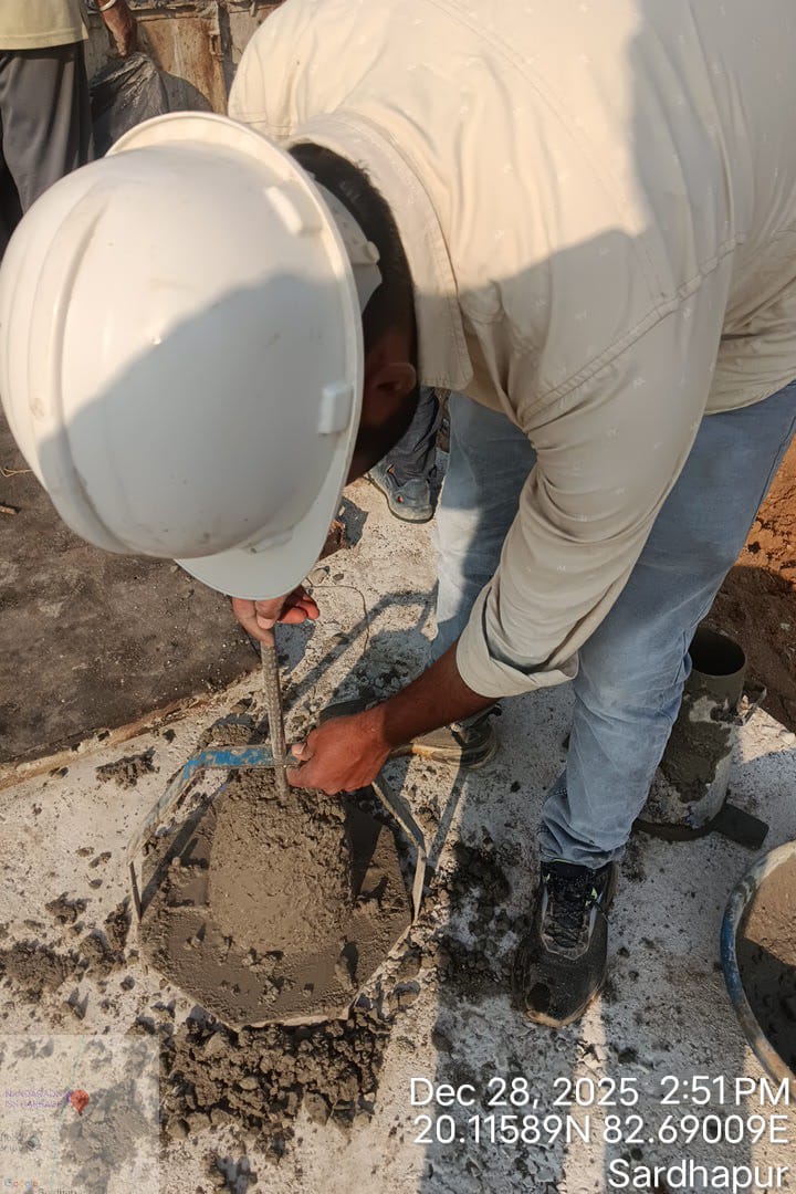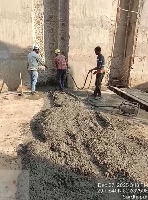 Casting of RCC concrete of grade M25 A20 for 16 numbers of building footings is in progress through concrete pump in the presence of the Department JE, PMC Site Engineer, and Agency representatives at site. slump achieved 84mm on 26.12.2025