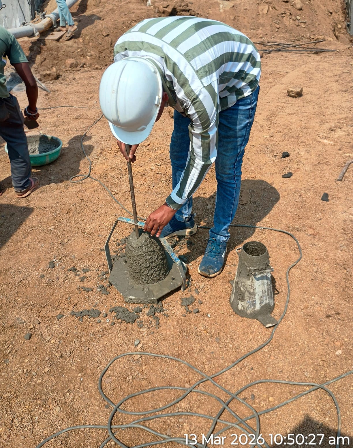 Casting of CC block PCC M20A40 grade is under progress in the presence of Dept JE, site engineer of PMC and agency. The slump test value is 72mm on 13.03.2026