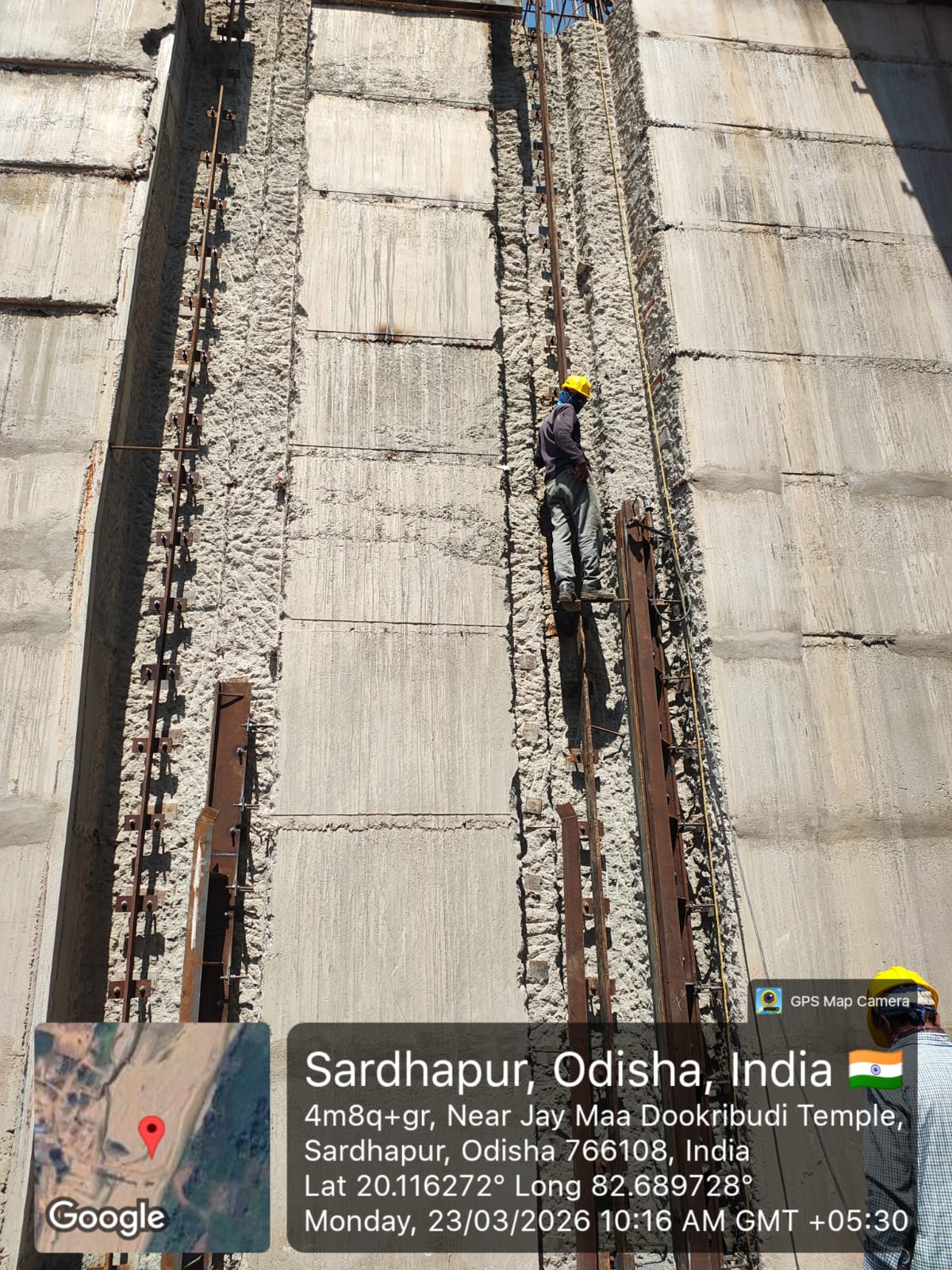 Cast of concrete 7th lift RCC M25A20 grade at right side D/s wing wall including 5nos CF from RL155.35m to 156.75m is under progress in the presence of Dept JE, site engineer of PMC and agency forman. The slump test value is 75mm on 23.03.2026