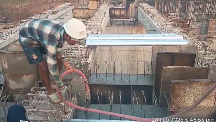 Concrete casting with RCC M35A20 grade for 2nos. cross girders at pier no.11 is in progress through concrete pump in presence of PM EPC agency,Site Engineer of PMC & EPC agency. The slump test value is 96mm on 26.02.2026
