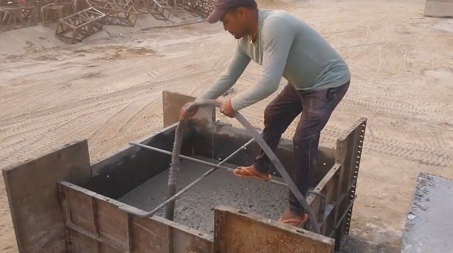 After successful inspection the shuttering, centring and reinforcement works were found to be completed properly. The surface was cleaned using an air water jet to remove dust and debris(P1 and A1).
